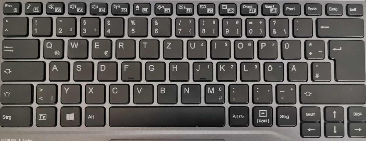 Tolle Tastatur: Die Tastatur ist sehr blindenfreundlich, denn sie hat wirklich gut von einander abgesetzte Tasten. Die Pfeiltasten sind nach unten rausgerückt, so dass man sie schnell finden kann. Es gibt eine echte Kontextmenütaste, was heut quasi schon eine Ausnahme ist und auch die Enter-Taste ist hochkant über zwei Reihen gezogen und liegt zum schnellen Finden ganz rechts außen.
